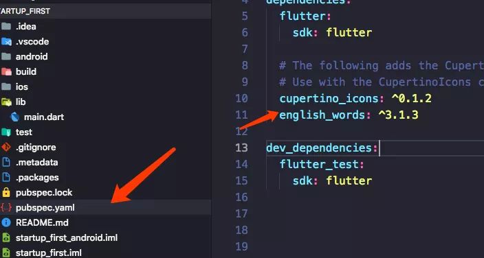 将english_words添加到pubspec.yaml文件中(pubspec文件