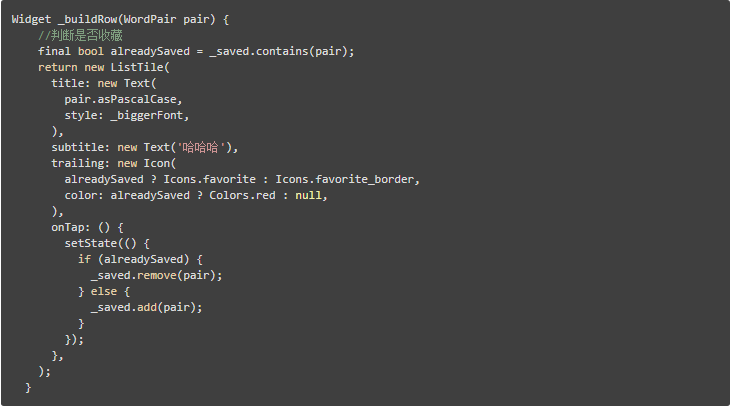 在 _buildRow中让心形❤️图标变得可以点击。如果单词条目已经添加到收藏夹中, 再次点击它将其从收藏夹中删除。当心形❤️图标被点击时,函数调用setState()通知框架状态已经改变。
