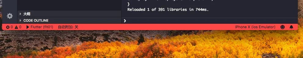 同样 shift + command + p 输入 ‘flutter’, 然后选择 ‘Flutter: New Project’ action 创建一个测试项目 vscode 底部展示附加设备