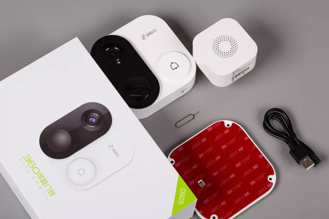 360 可视门铃 1C 产品内容:门铃主机、安装底座(含3M胶)、室内机安装、拆卸孔针、USB电源线 | 360