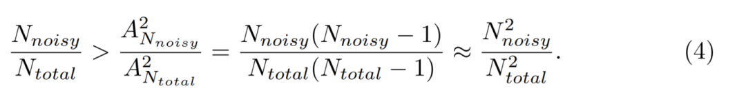 然而对于生成的一个新样本,为噪声样本的前提是K(=2)个样本均为noisy样本,那么其概率经过排列组合之后,其概率明显减小了: