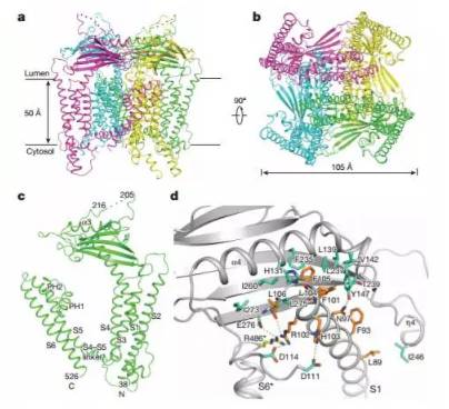 TRPML1是一种位于核内体与溶酶体膜上的阳离子通道,在哺乳动物细胞内普遍表达。如果它发生失活突变,就会导致严重的溶酶体贮积症。利用新鲜斩获诺贝尔化学奖的冷冻电镜技术,来自德克萨斯大学西南医学中心的姜有星教授课题组与白晓晨教授课题组联手获取了小鼠TRPML1通道位于nanodiscs中的结构。结构分析揭示,磷脂酰肌醇-3,5-二磷酸会结合该通道蛋白的N端,而S2与S3区域的螺旋-转角-螺旋区域可能会和配体发生偶联。此外,这个结构还发现了S4与S5区域链接部对于TRPML通道作用机制的潜在作用。