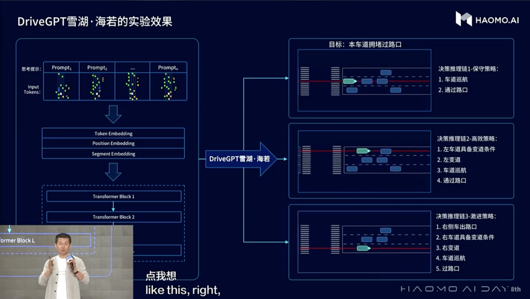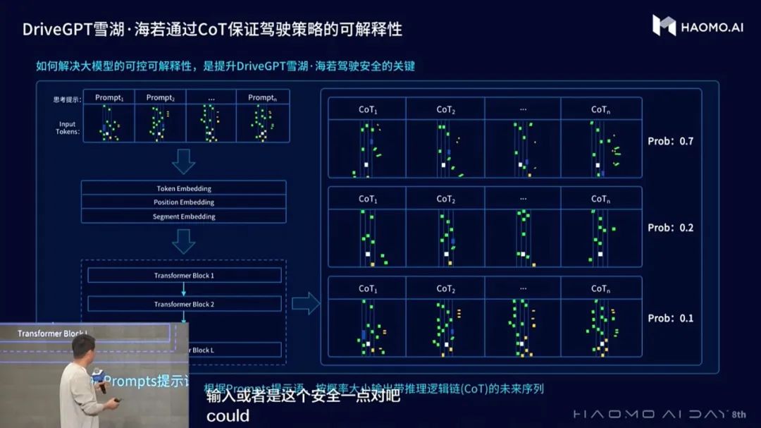 「DriveGPT 还能输出决策逻辑链,这里面利用了 Prompt 提示语技术,输入端需要给到模型一个提示,告诉它『要去哪、慢一点还是快一点、并且让它一步步推理』。经过这种提示后,它就会朝着我们期望的方向去生成结果,并且每个结果都带有决策逻辑链。每个结果也会有未来出现的可能性。这样我们就可以选择未来出现可能性最大,最有逻辑的链条驾驶策略。」顾维灏介绍。