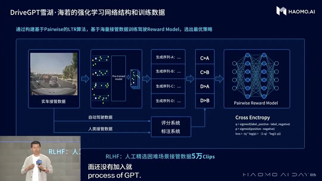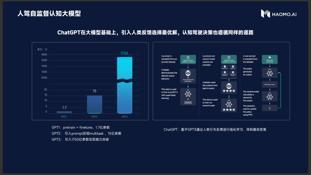 DriveGPT 雪湖・海若的训练,是根据历史去生成未来所有可能的场景,并根据概率推理出未来一段时间的多个可能。这一过程利用了大概万多的接管数据来进行 RLHF 训练,反馈数据当中就会隐藏了不同场景下错误的自动驾驶开法与正确的人类开法。看到这里,是不是有很熟悉的味道,那就是 DriveGPT 采用了和 ChatGPT 训练同源的算法。