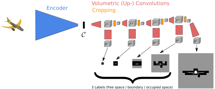 3D重建方面的一项最新工作[Choy et al. ECCV 2016, Girdhar et al. ECCV 2016]利用卷积神经网络(CNN)将物体的形状预测为一个3D体积。作为输出的3D体积被细分为体积元素,称为体素(voxel),每个体素被确定为被占用或空着(即,分别属于物体的内部或外部)。输入通常是一张彩色图片,CNN使用一个上卷积解码器架构来预测占用体积(occupancy volume)。网络被端到端地训练,并且由已知的真实占用体积进行监督,这些占用是从合成CAD模型数据集中获取的。使用这种3D表示和CNN,可以学习能够适用各种对象类的模型。