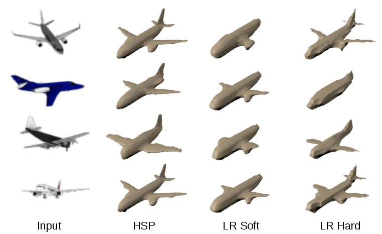 我们的实验主要是在合成的ShapeNet数据集上进行的[Chang et al. arXiv 2015]。我们的研究的主要任务是根据单一的彩色图像预测出高分辨率的3D图形。我们将我们的方法与我们称为low resolution hard(LR hard)和 low resolution soft(LR soft)的两个基线进行比较。这些基线以相同的低分辨率32³进行预测,但训练数据的生成方式不同。LR hard 基线使用体素的二进制分配。如果相应的高分辨率体素中的至少一个被占用,则所有体素被标记为被占用。LR soft基线使用分数赋值,反映相应高分辨率体素中占用体素的百分比。我们的HSP方法以256³的分辨率进行预测。下图中的结果显示了与低分辨率基线相比,在生成3D图形的表面质量和高分辨率预测的完整性方面的好处。我们的论文中讨论了更多实验和定量结果。