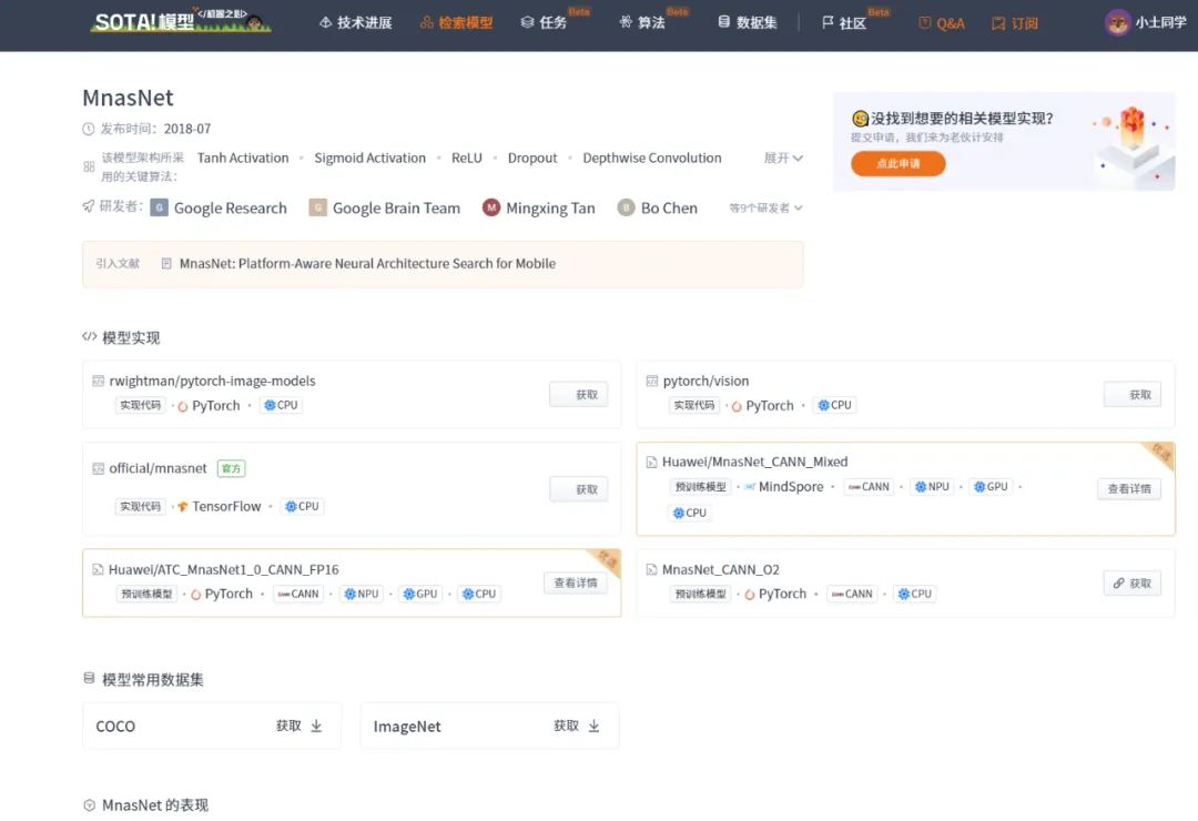 | MnasNet | https://sota.jiqizhixin.com/models/models/ca934188-fc29-435d-b98a-814b1d0592d7 收录总数:6 支持框架:PyTorch、CANN、MindSpore、TensorFlow 等 |