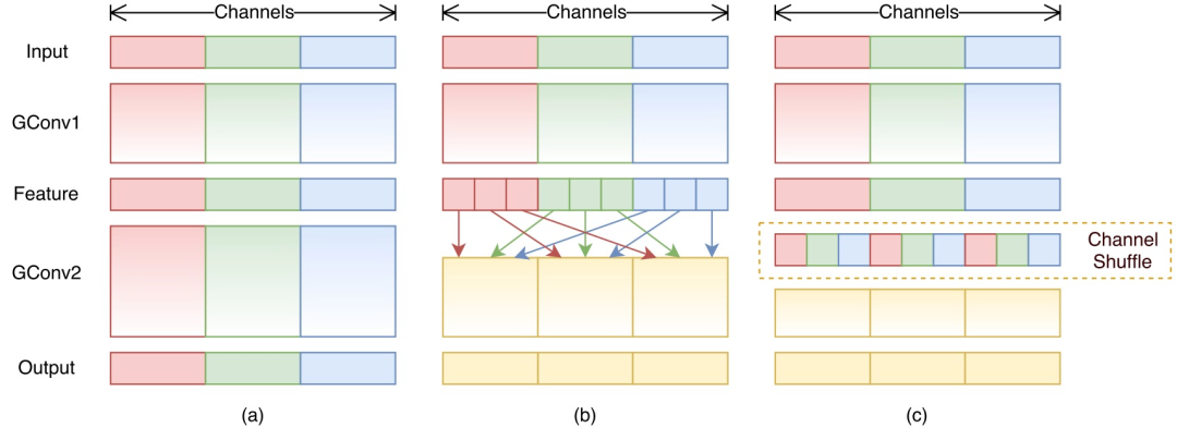 图2 用两个堆叠的分组卷积进行通道混洗。GConv代表分组卷积。a)两个堆叠的卷积层,分组数相同。每个输出通道只与组内的输入通道有关。没有交叉对话;b)当GConv2在GConv1之后从不同的分组中获取数据时,输入和输出通道完全相关;c)为与b)使用通道混洗的等价实现