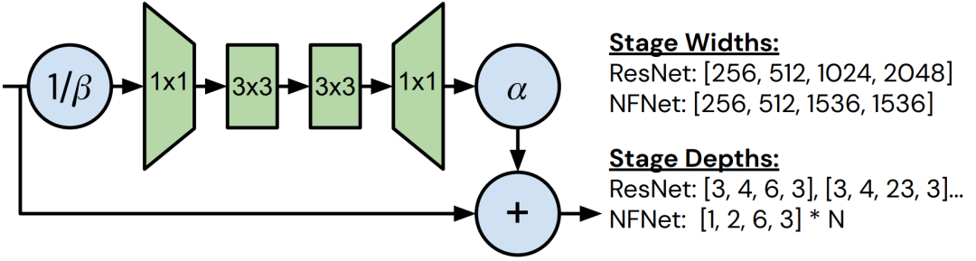 图8 NFNet网络结构图,应用 AGC 到除了最后的线性层上的每一层,得到最终的NFNet 配置
