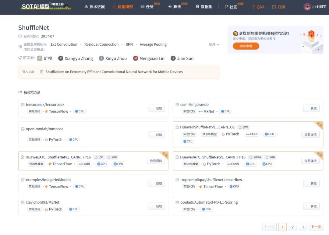 | ShuffleNet | https://sota.jiqizhixin.com/models/models/445701e7-940d-4905-bbce-cf47377adfc7 收录总数:26 支持框架:TensorFlow、PyTorch、CANN、MXNet 等 |