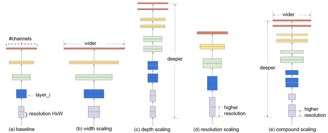 图6 模型缩放。(a)基线网络示例;(b)-(d)是传统的缩放方法,只增加网络宽度、深度或分辨率的一个维度。(e)是本文提出的复合缩放方法,以一个固定的比例统一缩放所有三个维度
