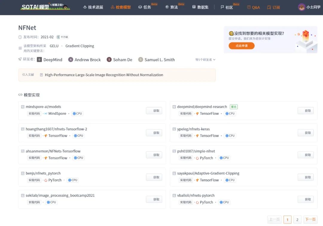 当前 SOTA!平台收录 NFNet 共 15 个模型实现资源,支持的主流框架包含 TensorFlow、PyTorch、MindSpore、JAX 等。