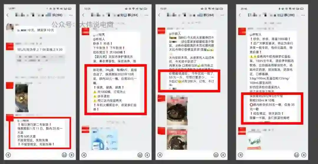 大爷会经常在群里发布类似于微商发的朋友圈,今天又多少用户下单了,还剩有多少余量可抢。