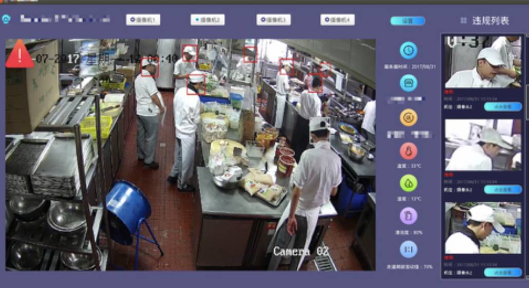 “阳光后厨”通过摄像头、显示屏到手机端和PC端管理、接入展示平台,利用人工智能和大数据技术,让“阳光后厨”可以成为辅助餐厅经营管理的工具,同时帮助管理者实现线上、线下的异常情况报警。