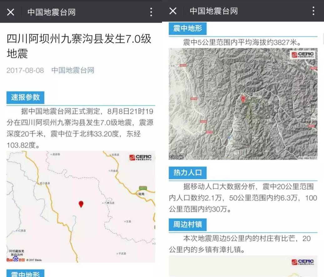 8月8日21时19分,四川九寨沟地震,机器人用25秒写了全球第一条关于这次地震的速报,通过中国地震台网官方微信平台推送,全球首发。这篇标题为《四川阿坝州九寨沟县发生7.0级地震》的速报全文585个字,在8月8日21时37分15秒自动编写。写这则速报的作者为“地震信息播报机器人”,它是国家地震台网研发的智能机器人。