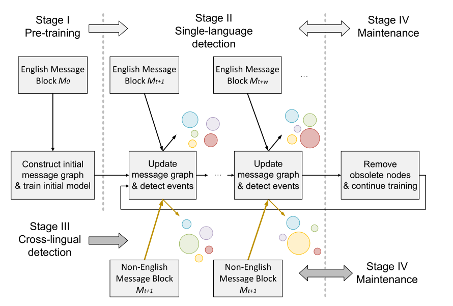 为了应对流消息的挑战,FinEvent采用了生命周期机制(如图1所示),该机制包括四个阶段,即预训练阶段、单语言检测阶段、跨语言检测阶段和维护阶段,分别如图1所示为阶段I、阶段II、阶段III和阶段IV。在预训练阶段,我们预先存储一小部分社会信息,在此基础上构建初始加权多关系信息图。然后,我们利用处理过的图来训练初始模型。在检测阶段,通过插入新的消息节点、其与现有消息节点的链接以及其内部的链接来更新消息块的加权多关系消息图,并重构加权关系。同时,在更新过程完成后,无需进行新一轮的训练,就可直接利用预训练模型从未见过的信息中检测社会事件。在维护阶段,我们在消息图中删除过时的社会消息,并使用更新后的消息图继续训练来维护模型。在此生命周期中维护的模型可以用于下一个生命周期的检测阶段。通过这样设计的生命周期机制,FinEvent能够很好地适应社会消息的流特性,实现在线方式的事件检测。