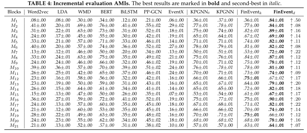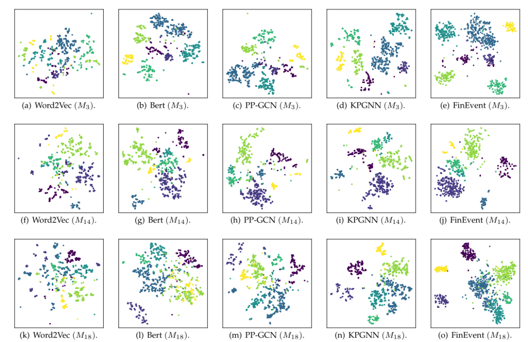 我们在表 9 中将 NMIs 结果作为它们的性能报告。FinEvent 的所有聚类类型都设置为 K-Means,以避免 DBSCAN 中不同参数选择的影响。观察到 FinEventcr 和 FinEventcg 的性能优于 FinEventr 和 FinEventg。具体而言,在15个区块中,FinEventcr与FinEventr相比领先12个区块,实现了1.7%~20.6%的提升。FinEventcg 在 12 个区块中也优于 FinEventg,并实现了 1.7% 到 20.8% 的改进。FinEventr 和 FinEventcr 的块平均 NMI 分别为 0.554 和 0.597。FinEventg 和 FinEventcg 的块平均 NMI 分别为 0.554 和 0.595。FinEventcr 和 FinEventcg 的可行性表明,在高资源英语数据集上训练的 FinE-vent中保存的知识可以扩展并指导低资源非英语数据集上的事件检测。此外,FinEventr 和 FinEventg 的相似性能也让我们了解到,尽管消息的语言表达方式不同,但消息图的语义和结构在事件检测中更为关键。