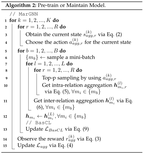 结合 GNN 和强化学习。有一些尝试将 GNN 和 RL 结合起来以提高图数据的表示学习能力。DeepPath [66] 是基于 RL 策略的知识图谱嵌入和推理框架,训练 RL 代理以确定知识库中的推理路径。RL-HGNN [67] 设计了不同的元路径来学习其有效表示,并使用基于 DRL 的策略网络在下游任务中进行自适应元路径选择。与 MarGNN 相比,RL-HGNN 模型更注重在异构图分析中揭示有意义的元路径或关系。与我们的 MarGNN 类似,CARE-GNN [27] 使用 Bernoulli Multi-armed Bandit 过程来选择邻居,Rio-GNN [68] 使用递归强化学习来加速离线时平衡滤波器阈值的过程。以提高 GNN 的有效性,但这些模型不再适用于加权图和增量场景。GraphNAS [69] 使用 RL 来搜索最优的图神经架构。Policy-GNN [70] 将 GNN 训练问题表述为马尔可夫决策过程,并且可以自适应地学习聚合策略以对不同节点的聚合的不同迭代进行采样。然而,GraphNAS 和 Policy-GNN 模型都没有考虑聚合中的异构邻域,尽管它们更关注神经架构搜索。
