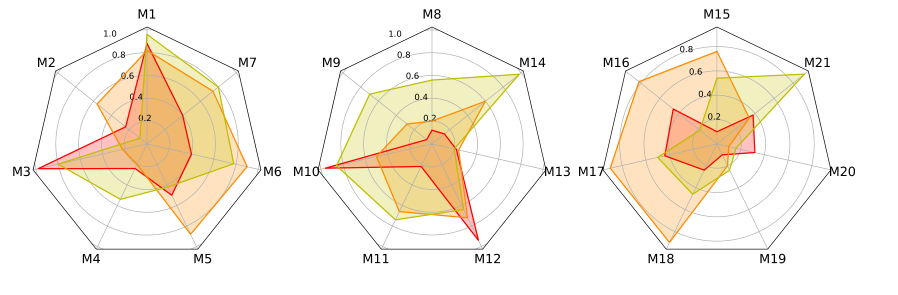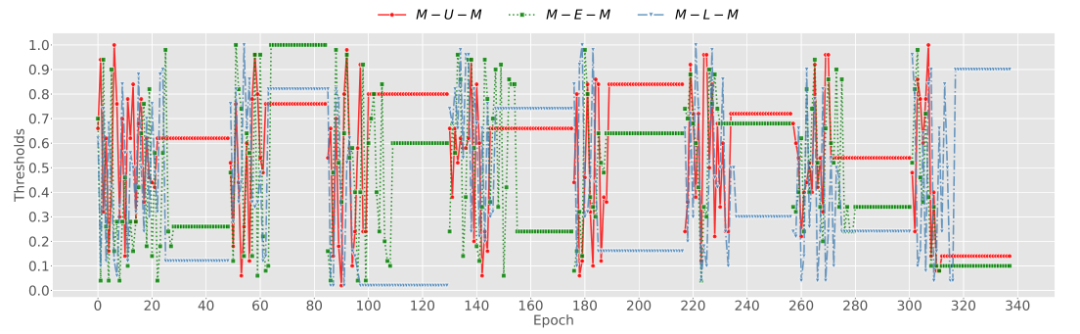 可解释性分析 此外,在训练或检测阶段,不同的智能体s最终会选择不同的保留阈值。各种阈值表示智能体s做出的不同贡献,可以抽象为 GNN 对不同关系的宏观关注。例如,如 M3 所示,关系 M-E-M 获得比其他关系更高的阈值,可能是因为在该块中占据更高的重要性。为了方便观察关系贡献的流动,我们还将一周内的保留阈值显示为雷达图(如图 2 所示)。它演示了块和事件结构随时间的变化。封闭区域可以近似视为一个关系对本周事件的整体贡献,因此我们可以直观地获得全局关系重要性。所有这些都为 GNN 事件检测提供了必要的可解释解释。