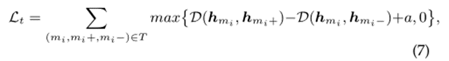 其中(mi, mi+, mi−)是一个三元组,T是一系列以[34]在线采样的三元组。D(,)计算两个消息之间的欧氏距离。max{.}用于获取两个元素中较大的一个。A是一个超参数,它决定了与正样本相比,消息离负样本有多远。