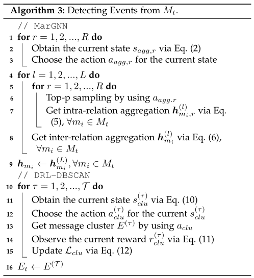 算法1显示了我们提出的FinEvent的生命周期。在生命周期中,加权多关系图是不断变化的。具体来说,我们初始化一个加权多关系图G在训练前阶段(3算法1行)。新消息到达时,也就是说,单一语种的检测或跨语言检测阶段,我们通过插入新的消息更新图G节点和建立连接算法1(第5行)。此外,在维护阶段,我们定期删除过期的节点和边缘,详细的维护策略见章节4.6。在训练前阶段对MarGNN的邻居选择器进行初始化和训练,在维护阶段继续进行定期训练,以便在新消息到达时对邻居选择器进行优化(算法2第15行)。在进行模型单语言检测或跨语言检测时,选择不更新,直接观察到新来的相似性让邻居(1 - 3算法3行)。值得注意的是,聚合模块将参与整个生命周期,无论是pretraining或维护和检测阶段(第4 - 9线在算法2,5 - 12线算法3)。MarGNN之后,BasCL只出现在训练和维护阶段(算法2第13行)。此外,DRL-DBSCAN部分只会参与生命周期的检测阶段,并在每个block中重新开始游戏进行优化。在游戏中,DRL-DBSCAN会进行一系列的动作改变,直到获得一个稳定的事件集群(算法3中10-15行)。