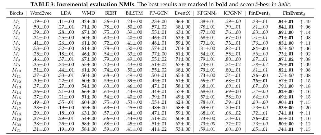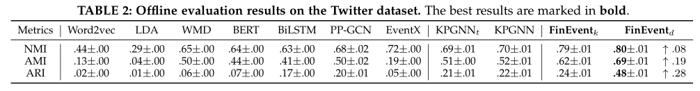 我们将 FinEvent 与一般消息表示学习和相似性测量方法、离线社会事件方法、增量方法和原始 KPGNN 进行比较。基线是:Word2vec [43],它使用消息中所有单词的预训练 Word2vec 嵌入的平均值作为其表示;LDA [44],一种生成统计模型,通过对底层主题和单词分布进行建模来学习消息表示;WMD [45],它通过计算一个词嵌入到另一个消息中需要经过的最小距离来测量两条消息之间的差异;BERT [46],它使用消息中所有单词的 BERT 嵌入的平均值作为其表示;BiLSTM [47],它学习消息中单词之间的双向长期依赖关系;PP-GCN [9],一种基于 GCN [48] 的离线细粒度社会事件检测方法;EventX [14],一种基于社区检测的细粒度事件检测方法,适用于在线场景。KPGNN,一种用于流式社会事件检测的知识保存增量异构图神经网络模型;KPGNNt,其中全局-局部对损失项 Lp 从损失函数中移除,仅使用三元组损失项 Lt。FinEventk,仅实现 K-Means 来对最终嵌入进行聚类。