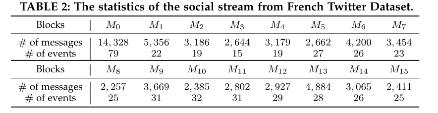 本节分别描述了来自英语和法语数据集的每个块中的消息数量和事件数量。具体如表1和表2所示。另外,社会流的时间消耗如图3所示
