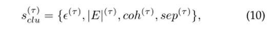 由当前最小邻居距离、簇个数|E|(τ)、平均内聚距离coh(τ)和平均分离距离sep(τ)[39]组成。这些状态受前一阶段的作用a(τ−1)的影响。