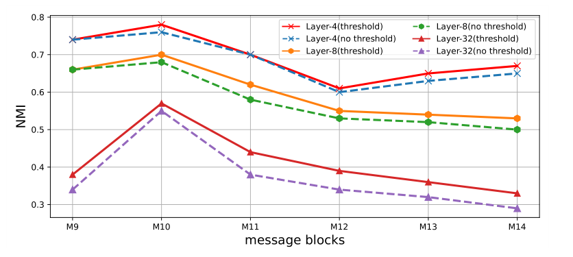 深层分析。 保留阈值也代表了一种可解释的方法来克服 GNN 中深层的过度拟合和过度平滑问题。为了验证我们的推论,我们设计了三种 FinEvent 变体具有 4/8/32 层,及其相应的模型,而不保留阈值。我们仍然采用最新消息策略并将窗口大小设置为 1,并在图 1 中报告模型在 M9 到 M14 上的性能。观察到保留阈值的 FinEvent 提高了所有案例的检测效果,并且随着层的增长,改进会更大。与 [1] 随机丢弃图中的边不同,FinEvent 中的多智能体根据某些规则及其学习实验丢弃边。综上所述,FinEvent 为深度 GNN 的改进提供了合理的边缘下降指令。