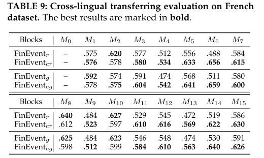 表9法语数据集的跨语言迁移评估。最佳结果以粗体标记