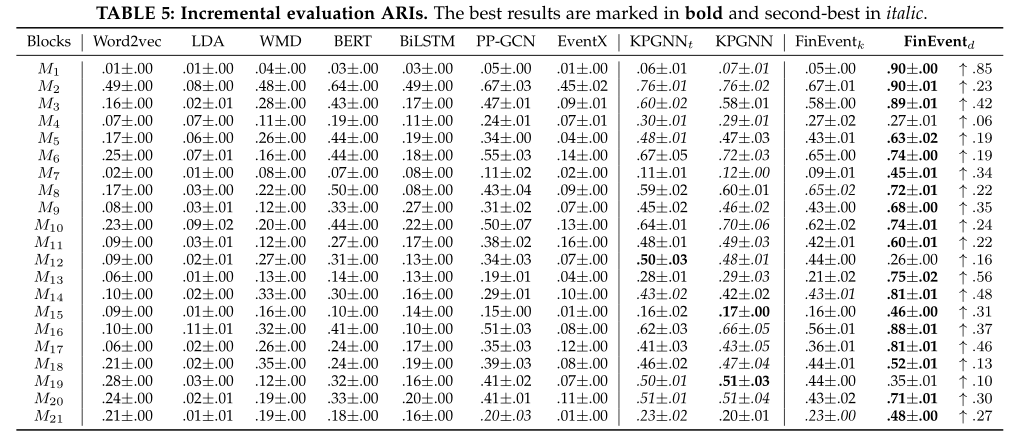 对于提议的 FinEvent,我们将 MarGNN 中的内部关系聚合的注意力头数设置为 4,嵌入维度设置为 64,总层数设置为 2,学习率设置为 0.001,优化器设置为 Adam,训练epochs 到 100,设置提前停止的patient为5,并选择最佳模型进行推理。BiLSTM 和其他基于 GNN 的基线使用与上述基本相同的配置,只是将维度设置为 32。此外,我们将 LDA 的topics总数设置为 50,并且对于 EventX采用原始论文 [14] 中建议的超参数。对于维护策略和BasCL,我们将三元边距a设置为3,使用大小为2000的小批量采样来提高训练效率,采用最新的消息策略和维护窗口大小为3(KPGNN和KPGNNt也使用这些)。对于MarGNN的多智能体强化学习算法Actor-critic,我们使用步长为 0.01 的离散动作空间在 [0, 1] 到每个保留阈值的范围内,并将每个关系的最佳阈值初始化为 1.0。对于 DRL-DBSCAN 的深度强化学习算法 TD3,我们设置范围为 [−5, 5] 的连续动作空间,Eps 的取值范围为 (0, 10],聚类边界为 [15, 100], batch size 为 32,降维的 perplexity 为 40。其中,初始参数是动作空间的中点。我们将所有实验重复 5 次,并报告结果的均值和标准方差。注意 KPGNN 和 FinEvent不需要预先定义事件类的总数,但是一些基线(Word2vec、LDA、WMD、BERT 和 BiLSTM)需要。为了公平比较,在从 WMD 获得消息相似度矩阵和从除了 EventX 之外的其他模型(EventX 没有预先定义其检测到的类的总数),我们分别利用 Spectral 和 K-Means 聚类,并将类的总数设置为 grounded-truth 类的数量。否则, 在增量检测的情况下,FinEvent 是为以前未知数量的类设计的。因此,我们还详细分析了自适应 DRL-DBSCAN 聚类模块,以展示我们的优势。实验中的完整架构被命名为 FinEventd 以便于区分。