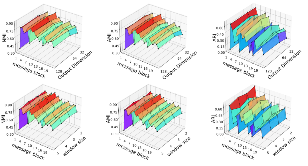 本小节研究超参数在增量社会事件检测实验中的影响。我们将 Twitter 数据集的隐藏嵌入维度设置为 128,以尽可能减少图熵,并且仅更改输出嵌入维度 d 和窗口大小 w。图 4 比较了 FinEvent 在采用不同的输出维度以及每个消息块的窗口大小时的性能。NMI、AMI 和 ARI 结果的平均偏差范围为 0.010.03。这表明 FinEvent 的指标随 d 和 w 变化,但相当显着。输出嵌入维度对 FinEvent 的性能影响不大。例如,输出嵌入维度的块平均 NMI 分别为 0.701、0.719、0.716。当 d 设置为 64 时,FinEvent 达到最佳性能。通常采用较小的窗口大小(2 或 3)会提供稍好的性能。例如,不同窗口大小的块平均 NMI 分别为 0.719、0.729、0.723、0.714,平均 AMI 分别为 0.693、0.702、0.698、0.687。当窗口大小设置为 3 时,FinEvent 获得最佳性能。一个可能的原因是,对于 Twitter 数据集,w = 3 对事件延续的适应性最好。总之,FinEvent 对超参数的变化很敏感。