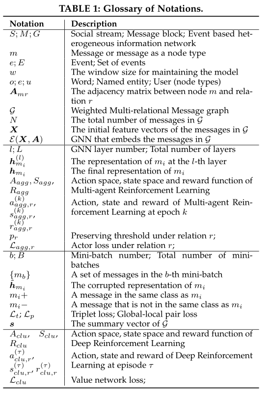 在本节中,我们总结了表1中的主要符号,并将社会流、社会事件、异构信息网络、加权多关系消息图、社会事件检测、增量社会事件检测和跨语言社会事件检测的定义形式化如下。