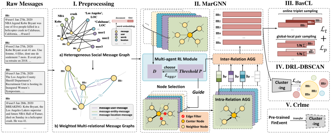 为了应对上述挑战,我们推出了一种新的强化的、增量的和跨语言的社会事件检测架构,即用于从流社会消息中检测事件FinEvent。该体系结构主要包含预处理、消息嵌入、训练、检测和传输5个模块。首先,我们利用异构信息网络[8] 将各种类型的面向事件的元素和关系组织成一个统一的图形结构。与以往利用元路径实例将异构图转化为同构图的方法([4]、[9]、[10])不同,我们首次提出了一种加权多关系图来建模社会消息之间的关联,并将元路径实例的数量保留为不同的边/关系权重。其次,我们提出了一种新的多智能体强化加权多关系图神经网络框架,即MarGNN,利用强化学包含习(RL)学习社会信息嵌入。具体来说,我们利用GNN学习表示社会信息中包含的语义和结构信息并使用多代理Actor-critic算法(AC)[24] 为每个关系学习最优数量/阈值,以便分别指导关系内和关系间的信息聚合。第三,为了解决社会事件检测中的长尾问题,设计了一种基于平衡采样策略的对比学习机制BasCL来指导框架的训练。然后,我们定期更新消息以保持一个最新的嵌入空间,并基于一种精心设计的基于MarGNN的知识保存技术实现增量式社会事件检测。第四,我们还设计了一种新的深度强化学习(DRL)指导的DB-SCAN模型,即DRL-DBSCAN,基于学习到的社会信息嵌入,自动实现社会事件聚类检测任务。通过DRL-DBSCAN,我们使用双延迟深度确定性策略梯度算法(TD3)[25] 学习最小点的最佳参数—形成聚类所需的最小样本数,以及ϵ—社会流中两个集群之间的最小距离。最后,提出了一种跨语言的社会信息嵌入方法,即Crlme,通过传递MarGNN的参数来提高目标语言(非英语)信息的嵌入性能。在Crlme方法的基础上,我们实现了跨语言社会事件的检测。