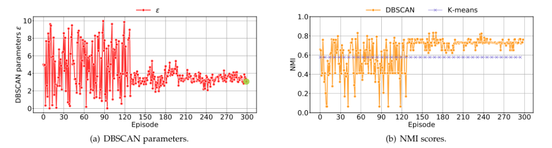 此处 为NMI分数,该分数使用实际的消息类别数量|E_{true}|对消息的表示进行聚类。消息的表示是基于动作 进行聚合的,我们将在第4.2.2节详细展开这个过程。需要注意的是,为了防止DRL-DBSCAN训练过程造成的干扰,我们使用K-Means作为聚类方法。