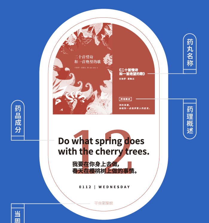 《文艺药丸日历 2022》采用了高对比度的色彩与夸张的设计,在浮躁的今天,希望能变身一颗颗药丸,拯救你的灵魂。每周都有一个主题病症,可能是长阅读无能症,或者是记忆紊乱症。而在当周 7 天,每一天的日历页都会提供一颗「药丸」,它可能是书名、歌曲或者是影视;接下来是「药品成分」,对应的是名句、歌词和台词。最后是一些日期信息。有病治病,无病强身。