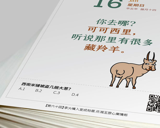 除了台词之外,每页日历底下还有一道知识考验。出题点都是来自剧中不起眼的一点剧情,比如「西铺米街被盗几捆大葱?」,等等…… 我竟然都不知道有西铺米街的存在?!