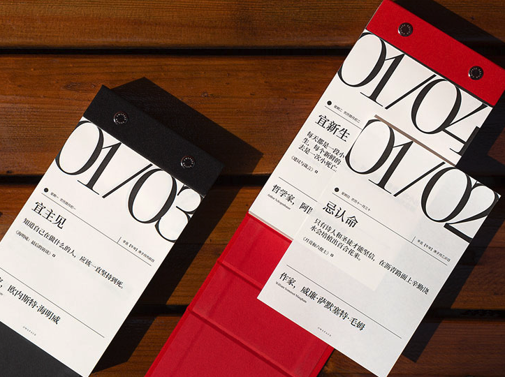 日历页也变了,日期以简约满溢的大字印刷在顶部,下方依次是传统的每日宜忌、书籍与歌词选句。到了重要的日期,还有作家与歌手的海报式日历页穿插其中,这本日历在和你对话。