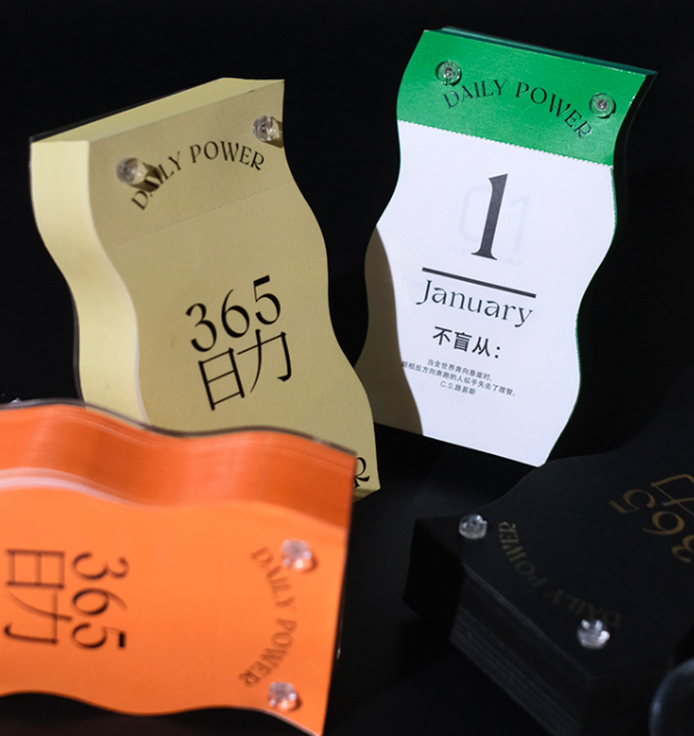 这是一款竖版的日历,造型狭长纤细。三种颜色分别是蓝色、静谧绿和落日橙,单条日历都装在相同配色的亚克力方盒内。盒子和日历本身都是一件高级的装饰。