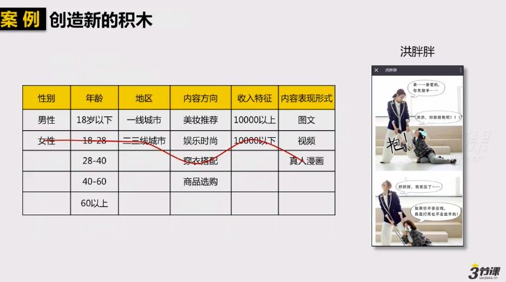 我们再来看课程中的另一个案例,“洪胖胖”这个账号,在内容表现形式上就走了真人漫画的路径,使得它成功在一些穿衣搭配账号里脱引而出。通过这个账号就可以看到,“积木模型”并不是固定不变的,只要你发现新的形式,都可以将其填入在积木框对应的条例,去勾画一条拟合自己品牌的路径。