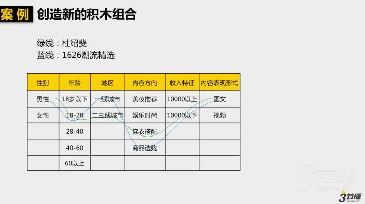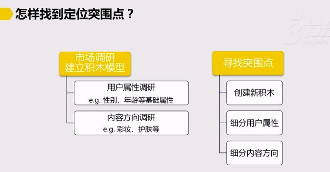如下图所示,如果是创造“新积木”,需要我们去找到从未有人涉及过的新内容或领域;如果是在原有的用户范围内细分用户属性,我们就可以选择只服务好一类用户,比如说孕妇,中学生等;如果是在原有的内容范围内细分内容方向,那么就可以专门某一类内容,比如在时尚类内容种选择脸部护肤等等。