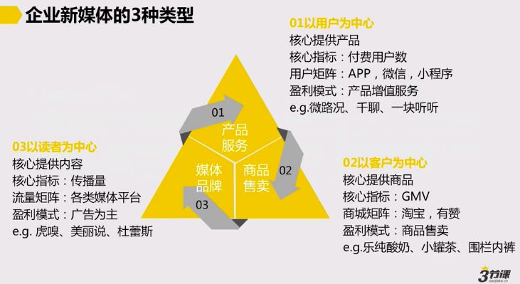 新媒体发展迄今已经经历三个阶段,1.0阶段属于编辑时代,好的内容自然就有传播。2.0阶段是运营时代,大家集中去做粉丝,打通社交关系。3.0阶段随着小程序等出现,配合社群等,新媒体单独可以作为平台业务出现。绝大多数企业新媒体的认知还停留在2.0阶段,很多传统企业甚至还停留在1.0时代,认为新媒体只是一个单纯编辑做的事。
