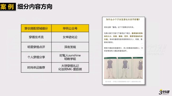 如下图所示,如果拿穿衣搭配这个领域去细分,可以分出四大类,而“女神进化论”这个账号,就巧妙的利用了技术的手段去剖析穿搭技巧,如“为什么小个人女生穿大衣不好看?”一文中就把人体结构画清楚给你讲解骨架比例对视觉的影响。当你在看这个号的内容时,就会感受到专业和科学。