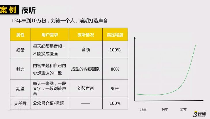 所以,我们可以观察到“夜听”这个账号的前中后期分别先满足了必备属性,将自己的声音打磨好,包括与音乐的结合;到了中期,有了成型团队后,就可以将内容主题打磨的更精细,因此后期粉丝就可以飞速增长。