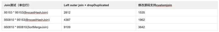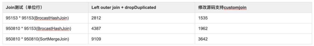 从结果上看性能差异已经没有那么明显了,但LastJoin还是会比前者方案快接近一倍,前面两组右表数据量比较小被Spark优化成broadcast join实现,最后一组没有优化会使用sorge merge join实现。从BroadcastHashJoin和SortMergeJoin最终生成的代码可以看到,如果右表只有一行拼接成功的话,LeftOuterJoin和LastJoin的实现逻辑基本是一模一样的,那么性能差异主要在于前者方案还需要进行一次dropDuplicated计算,这个stage虽然计算复杂度不高但在小数据规模下耗时占比还是比较大,无论是哪种测试方案在这种特殊的拼表场景下修改Spark源码还是性能最优的实现方案。