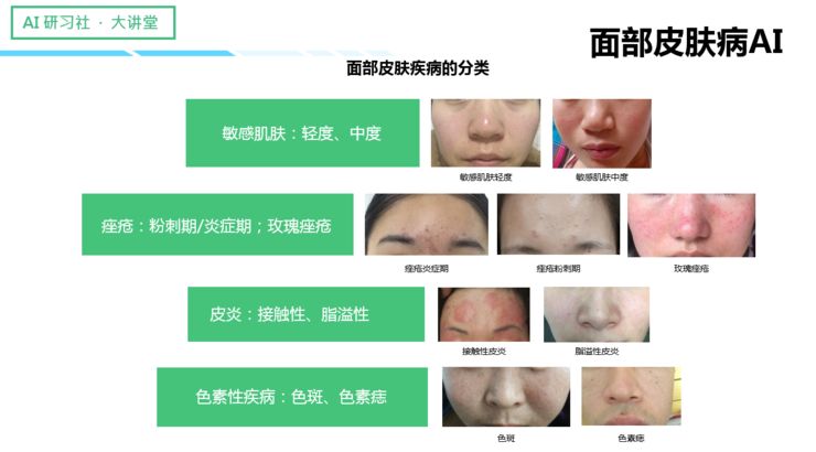 关于皮肤图像分析的案例,我会讲到银屑病 AI、面部皮肤病 AI 以及面部皮肤 AI 副产品,即皱纹斑点等目标检测处理这三个案例。