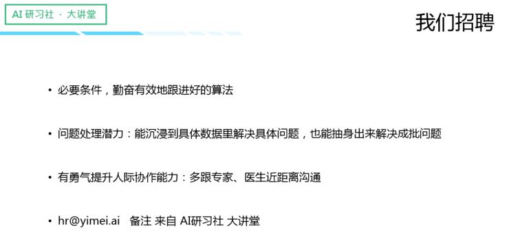 最后,分享了怎样跟医生做好 AI 合作,进而分享了 AI 工程师应该具备的几个能力以及需要进行哪些方向的修炼。