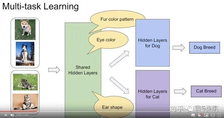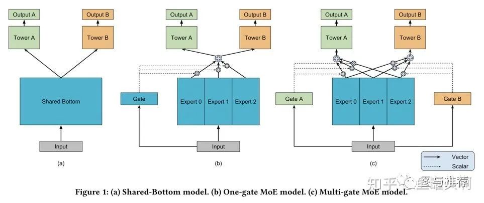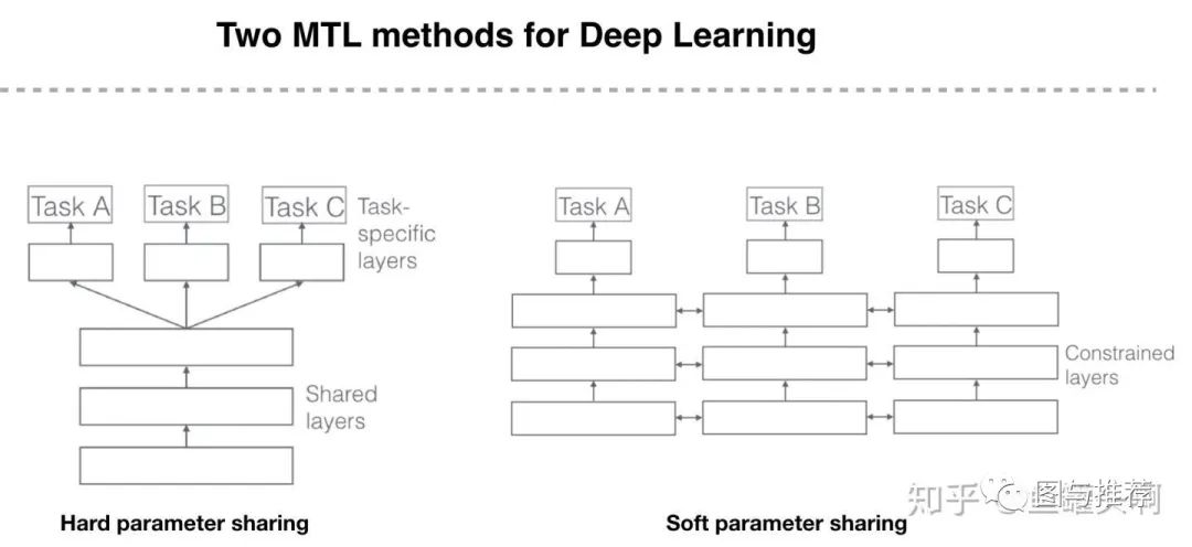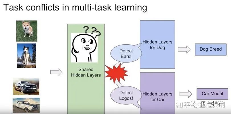2017年的这篇综述文章An Overview of Multi-Task Learning in Deep Neural Networks将多目标的方法分成了两类。第一类是Hard parameter sharing的方法,将排序模型的底层的全连接层进行共享,学习共同的模式,上层用一些特定的全连接层学习任务特定的模式。这种方法非常经典,但是效果还是不错的,美团、知乎在18年分享的文章美团“猜你喜欢”深度学习排序模型实践、知乎推荐页Ranking经验分享使用的都是这种方法。img这种方法最大的优势是Task越多,单任务更加不可能过拟合,劣势是底层强制shared layers难以学得适用于所有任务的表达。尤其是两个任务很不相关的时候。这个视频里给出了生动的例子,假设你的多目标预估是同时做猫狗的分类,那么底层的shared layer 学到的可能是关于眼睛、耳朵、颜色的一些共同模式。img而如果你的任务是做一个狗的分类,同时做汽车的分类,采用Hard parameter sharing的方法,底层的shared layer 很难学到两者共同的模式,多目标任务也很难学好。img谷歌在MMOE论文中的实验显示,任务相关性越高,模型的loss可以降到更低。img当两个任务相关性没有那么好时(例如,推荐系统排序中的点击率和互动率,点击率和停留时长等),Hard parameter sharing 的模式就不是那么适用了,会损害到一些效果。对应的,Soft parameter sharing的方式可能更加适合。img广义上MMoE方法也是Soft parameter sharing的一种。MMoE的全称叫做Multi-gate Mixture-of-Experts,在这篇论文发表前,还有个MoE模型(Mixture-of-Experts),下面先介绍MoE模型。MoE模型的底层将shared layer变成了多个expert,同时设置了一个gate,不同的任务通过gate的输出加权各个expert的输出。img其中fi(x)为第i个expert网络的输出,g表示gate网络的输出。MMoE在MoE的基础上,设计了多个gate(每个任务都对应一个gate)。对于第k个任务,输出为对应的gate加权各个expert的输出,然后接多层全连接得到每个任务的输出。imgMMoE是Google发表在2018 KDD的一篇文章,在2019年的RecSys上,Google又发表了一篇MMoE的应用文章Recommending What Video to Watch Next: A Multitask Ranking System。算法的应用离不开其场景,这篇文章应用在Youtube视频推荐的场景中,其优化的多目标包含engagement objectives(点击率、完播率)和satisfaction objectives(喜欢、评分)。img详情页的场景大多都面临着各种bias问题。包括position bias,user bias,trigger bias等。position bias指的是不同坑位天然的xx率指标都不同;user bias表示着不同用户天然的xx率不同,有的用户爱点,有的用户不爱点;trigger bias表示这个内容出现在不同的详情页下,xx率也并不相同。Youtube这篇论文解决的是position bias的问题,下图以点击率为例,可以看出youtube的详情页场景的点击率面临着严重的position bias问题。imgYoutube解决这个问题使用的方式是使用一个shallow tower来建模xx率的position bias。这个shallow tower的输入特征只采用一些selection bias特征,结果加入到user engagement objectives中(Youtube认为这些指标的position bias比较大)。img这个shallow tower实际学到了什么呢?论文中将学到的position bias打出来了,发现确实,position靠前的坑位,值要更大一些。MMoE出来后,确实在工业界掀起了不小的水花,包括阿里在内的一些公司都对MMoE进行了改进,适配到自己的场景上,取得了效果。下面也想抛出一下自己的一些问题和想法,和大家讨论下。1.shallow tower放置在expert中是否更加合理?不同指标的position bias的严重程度可能不一样,在expert外学习统一的position bias可能不是十分合理。shallow tower放置在expert中是否更加合理?2.各个expert学到了什么?我们希望某个expert和task强相关,怎么办?Youtube的论文中,分析了不同expert和各个目标之间的关系(其实就是看各个gate的softmax值)。可以看到不同的expert确实在不同的任务中的重要性不同。但是这种expert和task的对应关系是随机决定的。而在一些情况下,我们需要某个expert和某个task之间存在强相关关系。这个时候可以在输入gate前,加入一些预设好的任务和expert权值关系,或者直接修改softmax函数,让占比大的更大。但这种方式比较粗糙,还有没有更加优雅的解决方式呢?img