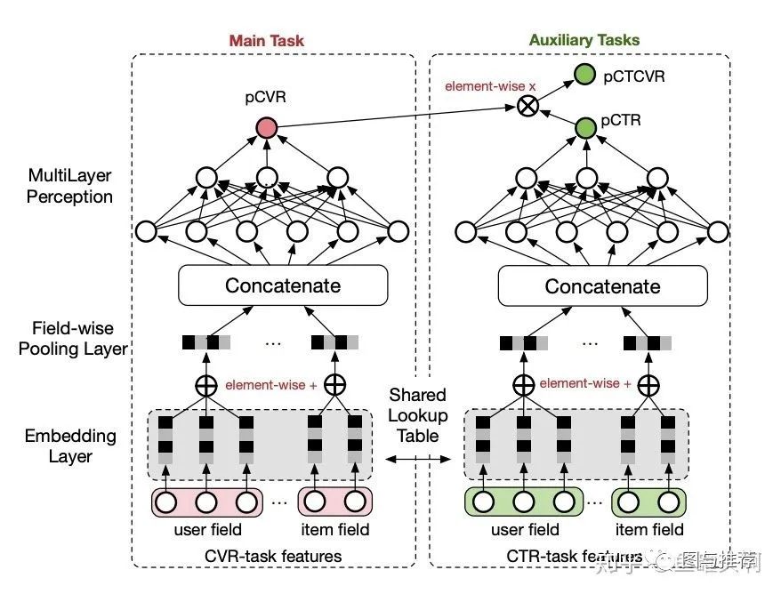 好了,是时候进入第二种范式了,我把它称之为任务序列依赖关系建模,代表作为阿里妈妈在2018年提出来的Entire Space Multi-Task Model (ESSM)。在推荐系统中,不同任务之间通常存在一种序列依赖关系。例如,电商推荐中的多目标预估经常是ctr和cvr,其中转换这个行为只有在点击发生后才会发生。这种序列依赖关系其实可以被利用,来解决一些任务预估中存在的样本选择偏差(Sample Selection Bias,SSB)和数据稀疏性(Data Sparisity,DS)问题。简单介绍一下什么是SSB问题和DS问题。SSB问题:后一阶段的模型基于上一阶段采样后的样本子集进行训练,但是最终在全样本空间进行推理,带来严重的泛化性问题。DS问题:后一阶段的模型训练样本通常远小于前一阶段任务。img事实上,通过观察下面公式中pctcvr、pctr、pcvr之间的关系,可以找到解决上面问题的方法。img上面公式可以转化为img那么,我们可以通过分别估计pctcvr和pctr,然后通过两者相除来解决。而pctcvr和pctr都可以在全样本空间进行训练和预估。但是这种除法在实际使用中,会引入新的问题。因为pctr其实是一个很小的值,范围一般在百分之几,预估时会出现pctcvr>pctr的情况,导致pcvr预估值大于1。imgESSM巧妙的通过将除法改成乘法来解决上面的问题。它引入了pctr和pctcvr两个辅助任务,训练时,loss为两者相加。imgESSM是一种较为的通用的任务序列依赖关系建模的方法,除此之外,阿里的DBMTL 、ESM^2等工作都属于这一范式。