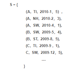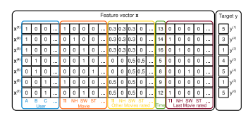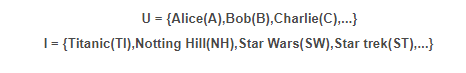 下面我们以论文中给的电影评分数据,通过实际的例子来解释为什么FM对于稀疏数据有很好的表现。数据集中每一条记录都包含了哪个用户u在什么时间t对哪部电影i打了多少分r。假定用户集U和电影集I分别为: